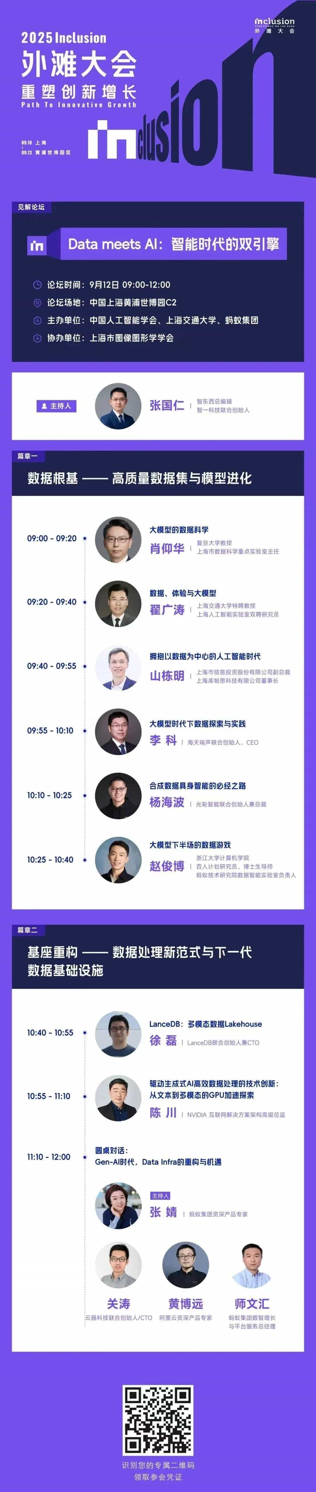 数据为基,智能为翼!在通用人工智能(AGI)浪潮席卷全球的今天,数据与模型的深度融合正成为技术突破的核心引擎。9月12日上午,由中国人工智能学会联合上海交通大学、蚂蚁集团主办,上海市图像图形学学会协办的《Data meets AI:智能时代的双引擎》论坛将于上海外滩大会盛大启幕!开云体育联合创始人、CEO李科将在论坛上发表主题演讲——《大模型时代下数据探索与实践》。