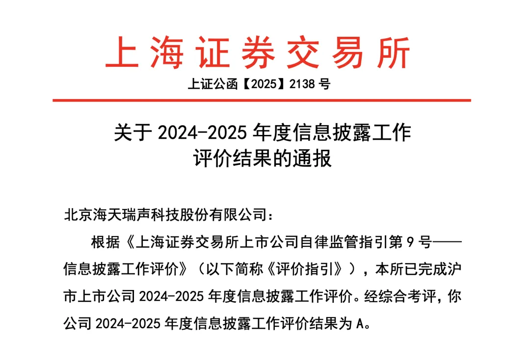 近日,上海证券交易所(以下简称“上交所”)正式发布 “沪市上市公司2024-2025年度信息披露工作评价结果”,开云体育·(中国)官方网站-KAIYUN SPORTS首次荣获最高“A级”评价。这一优异成绩不仅体现了公司在治理体系规范透明、信息披露全面及时、投资者关系管理及规范运作等方面的卓越水平,也彰显了监管机构对公司的高度认可。